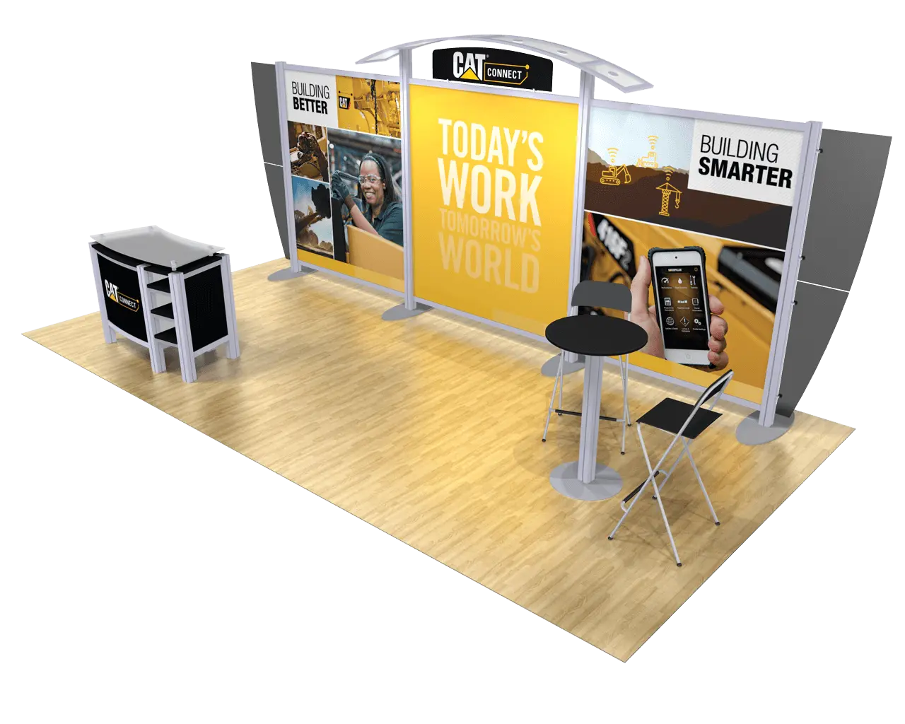 Three large graphic panels create this versatile booth's backwall. A center canopy impactfully highlights the header graphic with LED down-lighting. Kit includes an information counter featuring product shelving. *Table and chairs are not included*