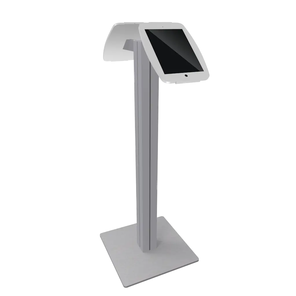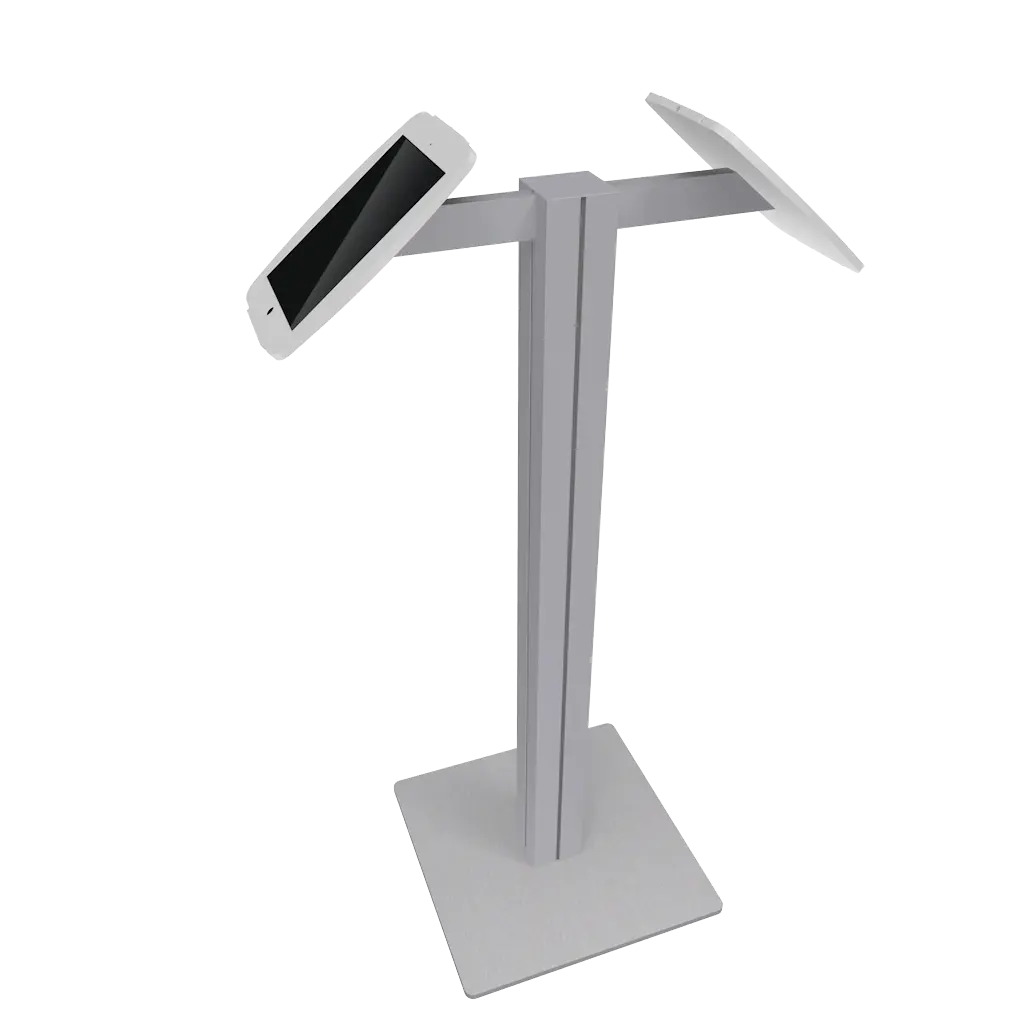 Sturdy aluminum dual iPad stand featuring a locking mount. This straight-post stand can be assembled in minutes. Locking frame for iPads available in black and white.